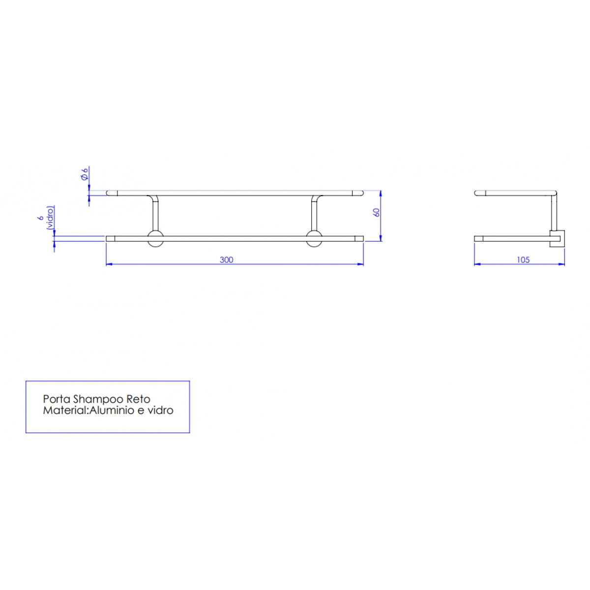 Porta Shampoo em alumínio anodizado e vidro com 6 mm. Banho de anodização realizado, o qual é específico para peças produzidas em alumínio, dando a proteção necessária ao produto, sem correr o risco de descascar, pois o mesmo não cria camada.